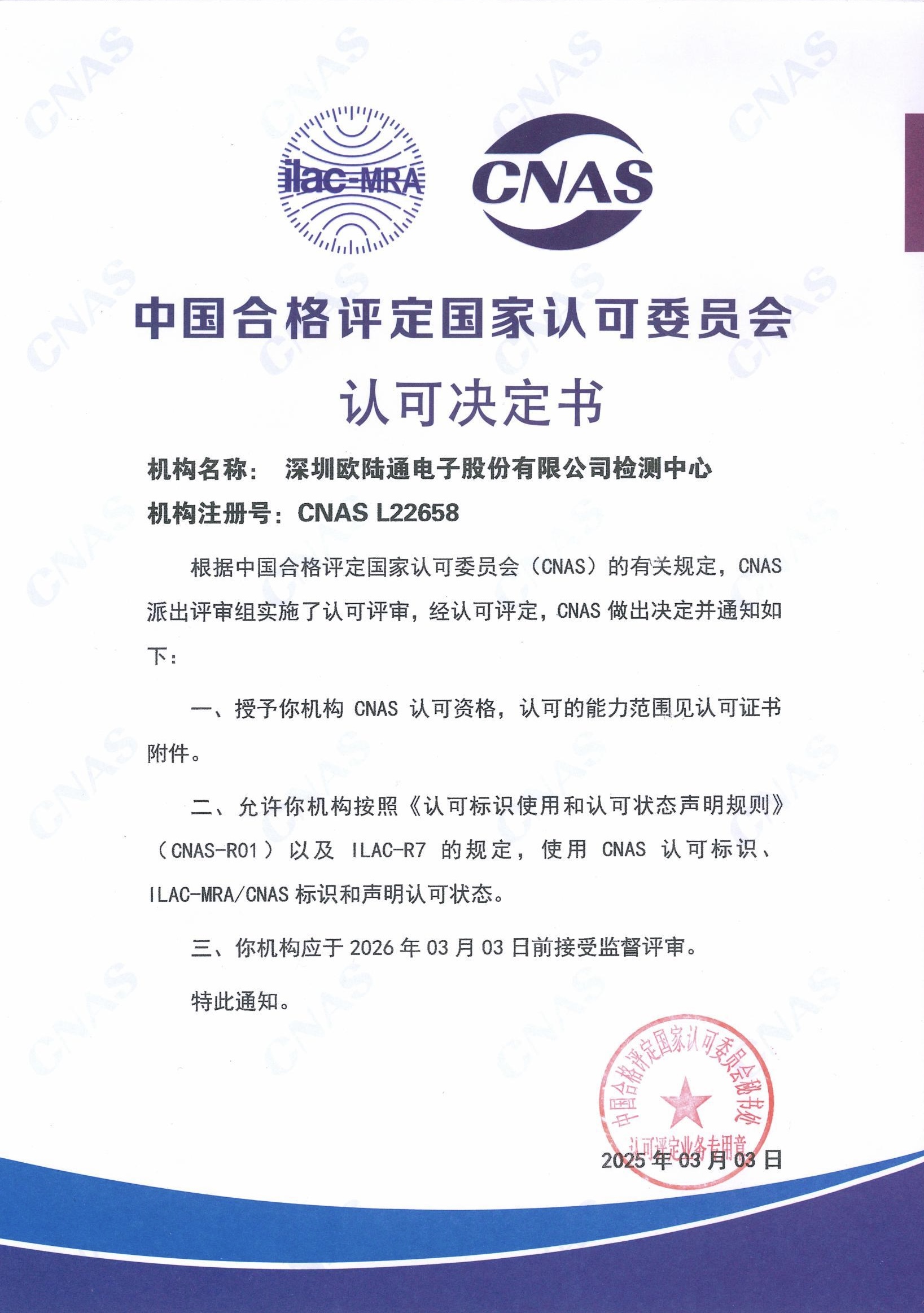 近日,歐陸通實驗室順利通過了中國合格評定國家認可委員會(CNAS)資質評審及合格評定,榮獲國家級CNAS實驗室認可證書,標志著公司實驗室的測試能力與管理體系已達到國際互認水平,檢測報告和結果可實現在全球上百個國家和地區的互信認可。